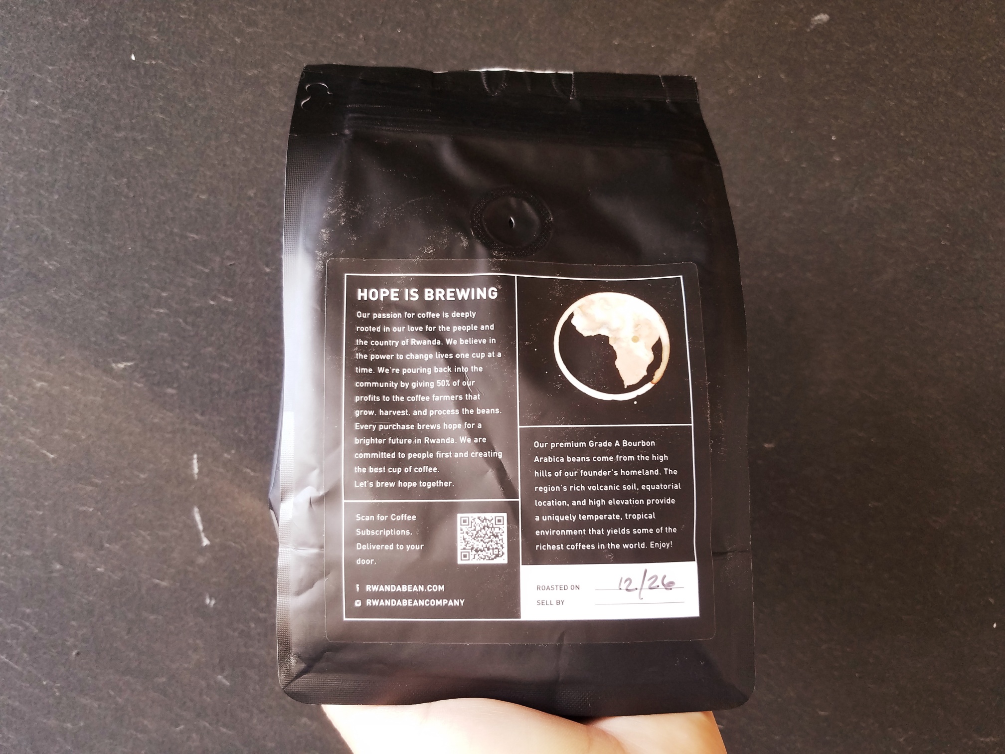The bag proceeds to specify the type of beans on the table: bourbon Arabica grown in Rwanda’s legendarily volcanic soil. The bourbon coffee variety is one I’m enjoying the opportunity to try more of. While it doesn’t produce a lot of cherries, it does produce a sweet, syrupy, and full-bodied result.