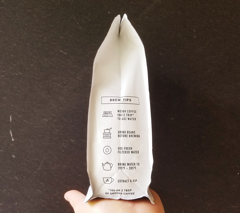 As for the packaging design, this is one of the most minimalist and detailed coffee bags I’ve reviewed yet. Isn’t that interesting? The front of the bag is straightforward, detailing the flavor notes, origin, and decaffeination process. Turning the bag to the side gives you a fun visual list of brewing methods with tips on temperature and steep time. Turn it again to the bottom and you get a splashy decorative pattern.